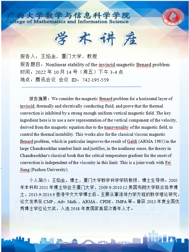 学术报告:Nonlinear stability of the inviscid magnetic Benard problem