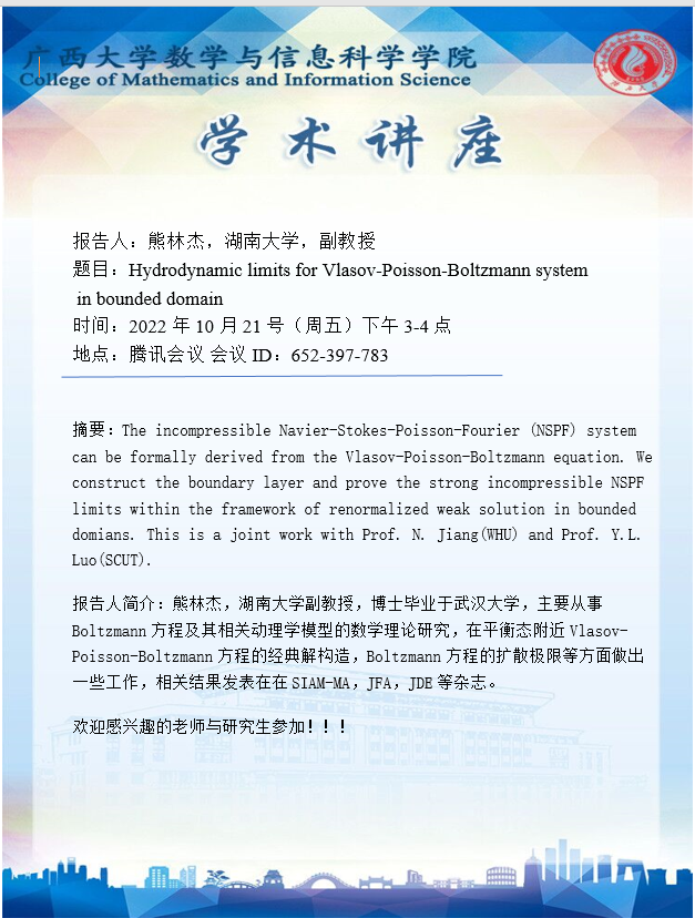 学术报告:Hydrodynamic limits for Vlasov-Poisson-Boltzmann system in bounded domain