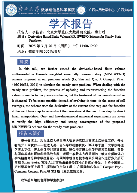 学术报告:Derivative-Based Finite Volume MR-HWENO Scheme for Steady-State