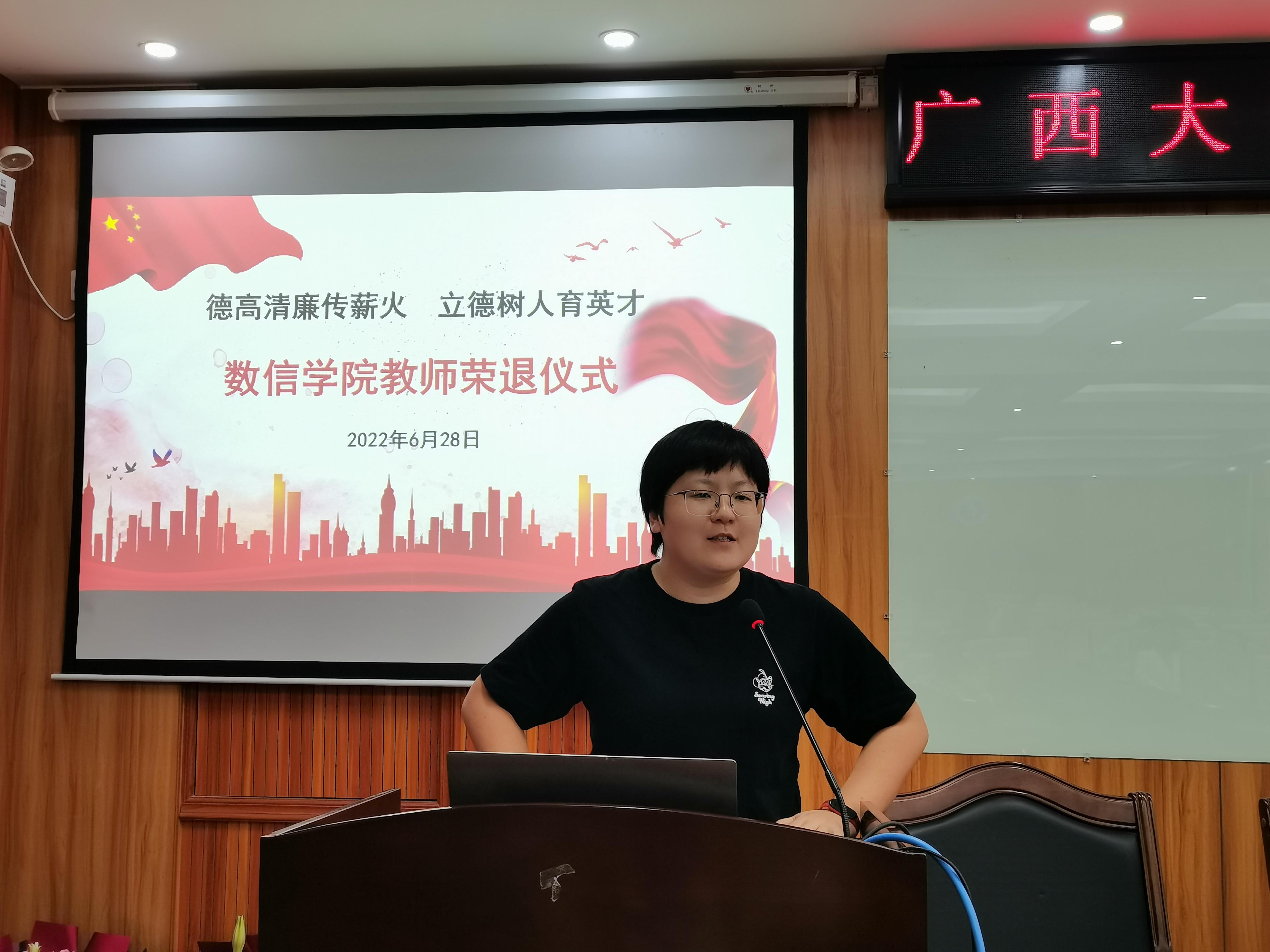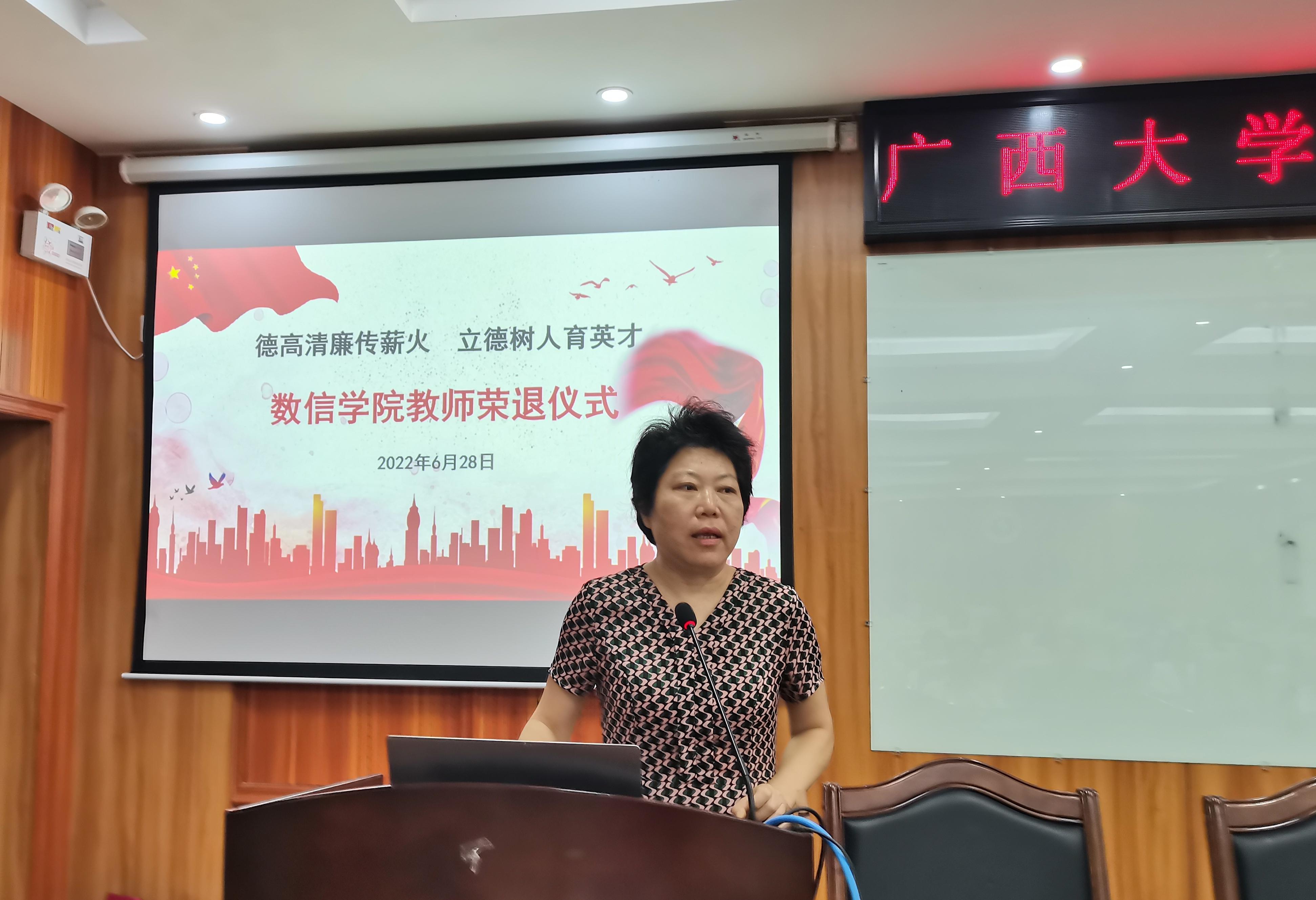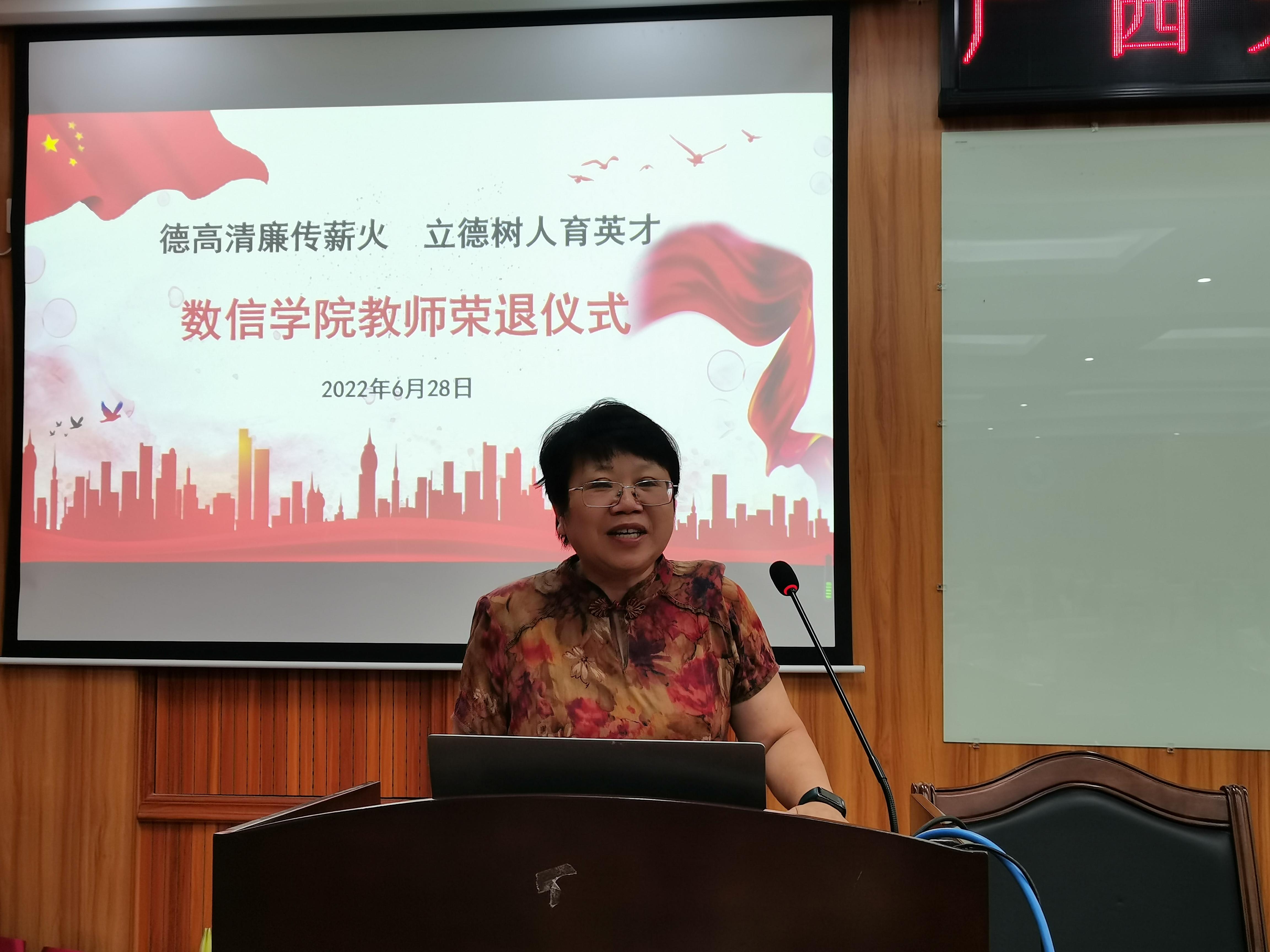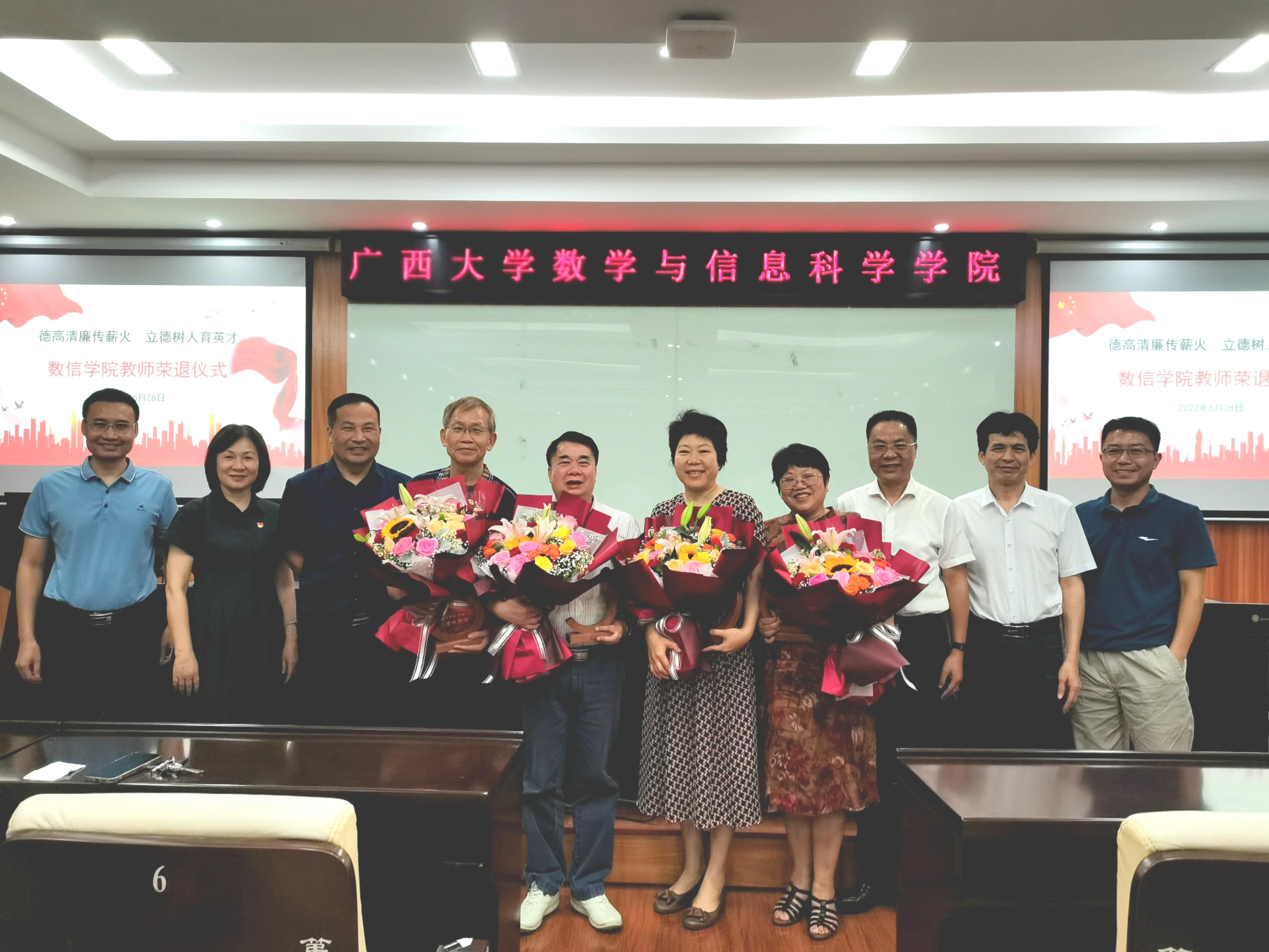 2022年6月28日,数信学院为余新华、严邦宁、韦增欣、吴如雪和梁革英5位退休教师举行了以“德高清廉传薪火,立德树人育英才”为主题的教师荣退仪式。仪式由院工会主席唐春明主持,学院全体教职工参加了此次仪式。