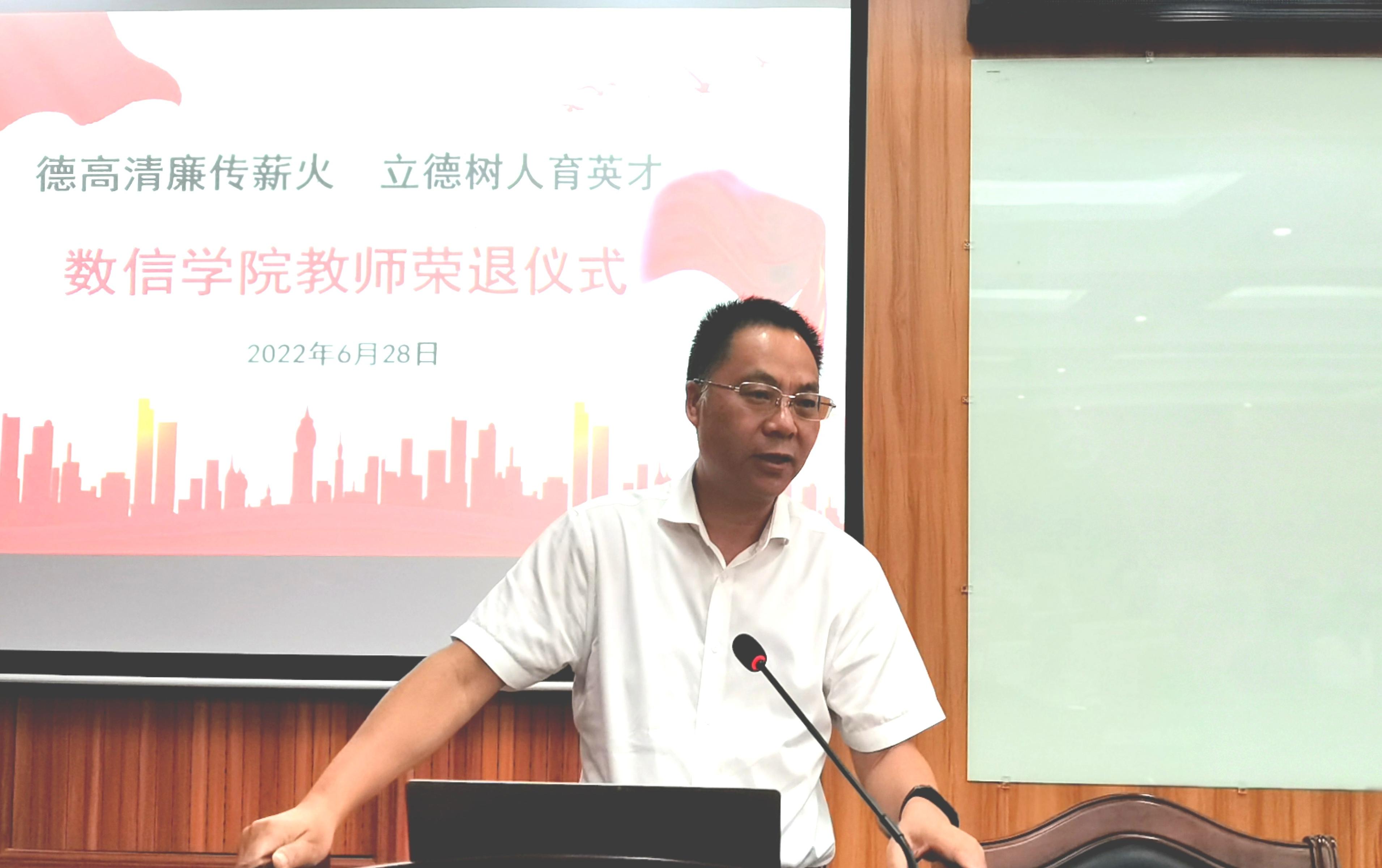 院党委书记黄建荣指出,教师身上有老黄牛的精神,吃的是草,挤出来的是奶。他祝贺退休教师们在教师岗位上光荣退休,感谢他们在教师岗位上风风雨雨几十载,汇聚个人力量共同推动学院不断迈上新的台阶,祝福他们开启新的生活,也希望他们离岗不离情,继续关注学院的发展和青年教师的成长。
