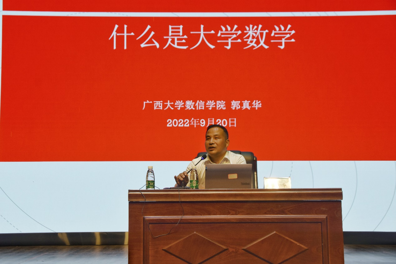 开学典礼结束后,由学院院长、博士生导师、广西大学君武学者郭真华教授为全体新生讲授开学第一课。郭真华院长从“什么是大学”“什么是大学数学”“如何学好大学数学”三个层面,阐述了大学 “立德树人”历史使命的由来和内涵,详细介绍了大学数学作为基础学科的深刻含义、现阶段的重要地位以及学院当前“数学拔尖人才培养实验班-研究型人才”“数据科学实验班-应用型人才”两种数学人才的培养思路,并对在大学如何学习数学、理解数学向新生们提出了具体的指导建议。