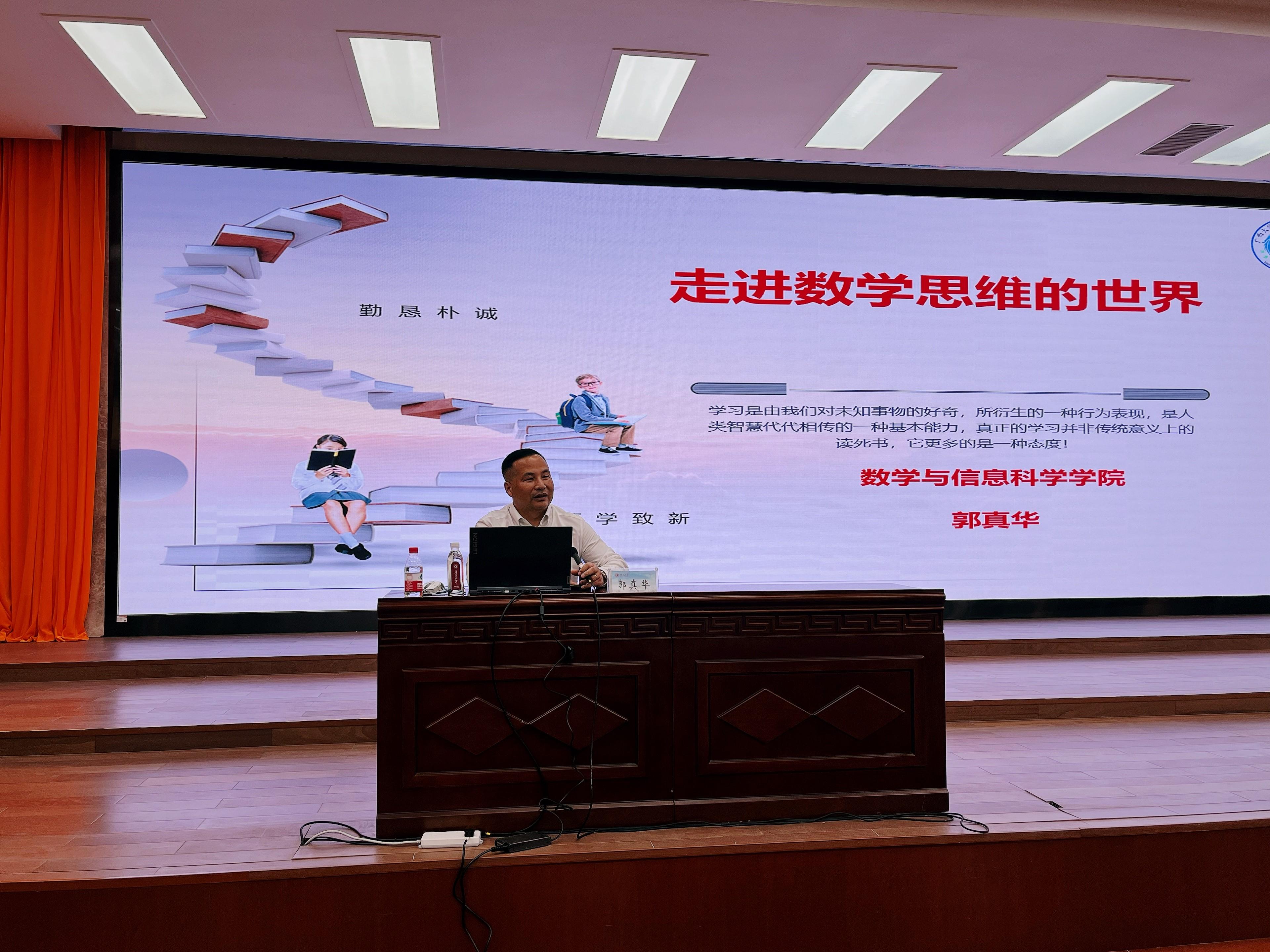 9月12日,数信学院院长、博士生导师、广西大学君武学者郭真华在君武馆玉林厅为2023级新生讲授开学第一课。