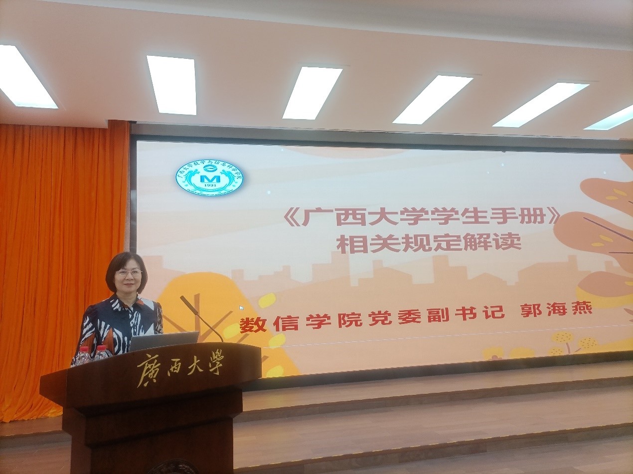 郭海燕副书记重点讲解了学生宿舍管理规定、学生考试违规处理办法、课程考勤制度、校园安全规范等广西大学学生系列规章制度,并结合实际案例强调了遵规守纪的重要性,鼓励同学们严明纪律端正作风,遵守规则促进成长,树立正确的世界观、人生观和价值观。