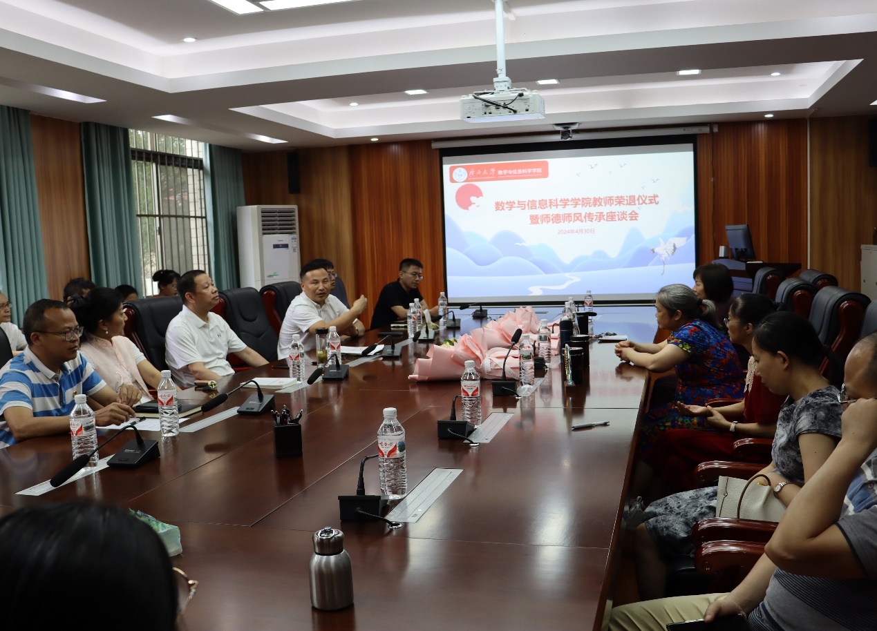在214会议室举行教师荣退仪式暨师德师风传承座谈会。院党委书记覃宪儒、院长郭真华、学院领导班子全体成员,荣退教师及教职工代表出席仪式。荣退仪式由副院长石志刚主持。