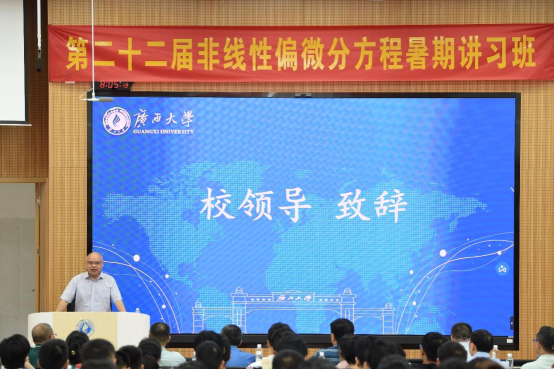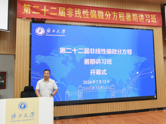 2024年7月12日,在国家自然科学基金数学天元基金委员会和协办单位的大力支持下,由我校承办的第二十二届非线性偏微分方程暑期讲习班(初级班)开幕式在广西大学第十教学楼A座305隆重举行。
