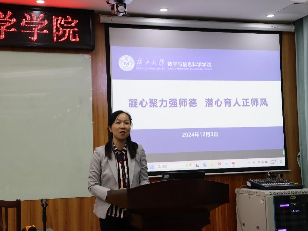 吴华丽在会上作了题为“凝心聚力强师德 潜心育人正师风”的专题报告,她首先带领大家共同学习了习近平总书记关于教师队伍建设的重要论述,提出全院教职工必须进一步强化教育家精神引领,贯彻新时代党的教育方针,落实立德树人根本任务,努力提升教书育人水平,争做新时代“四有”好老师。接着,她结合教育部网站上通报的以及今年发生的几起高校教师违反教师职业行为十项准则的典型案例,对《新时代高校教师职业行为十项准则》《高等学校教师职业道德规范》《研究生导师指导行为准则》等规章制度进行了解读,带领大家共同学习了《广西大学教师师德失范行为处理办法(试行)》,要求全院教职工务必知红线、守底线、筑牢意识形态思想防线,对照规定和要求勤自查、常自律。最后,她对学院正在开展的“清廉数信”建设工作提出了“认同当下、认同过去、认同他人、认同自己”的“四个认同”要求,要求全院教职工务必提高站位、拓宽视野、加强协同,秉持“凝心、传承、开放、自信”的数信人优良传统,积极参与“清廉西大”和“清廉数信”建设,共同打造风清气正的干事创业环境,携手共创数信学院美好明天。