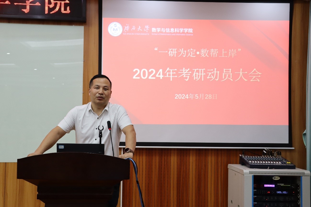 2024年考研动员大会在学院109报告厅举行,此次大会旨在帮助即将踏上考研征程的学子们明确目标、提振信心,并为他们提供宝贵的备考经验和指导建议。学院院长郭真华、各系主任、各毕业班班主任、全体辅导员、2023届毕业班学生代表以及2021级全体学生参加了大会。会议由学院党委副书记唐旭彬主持。