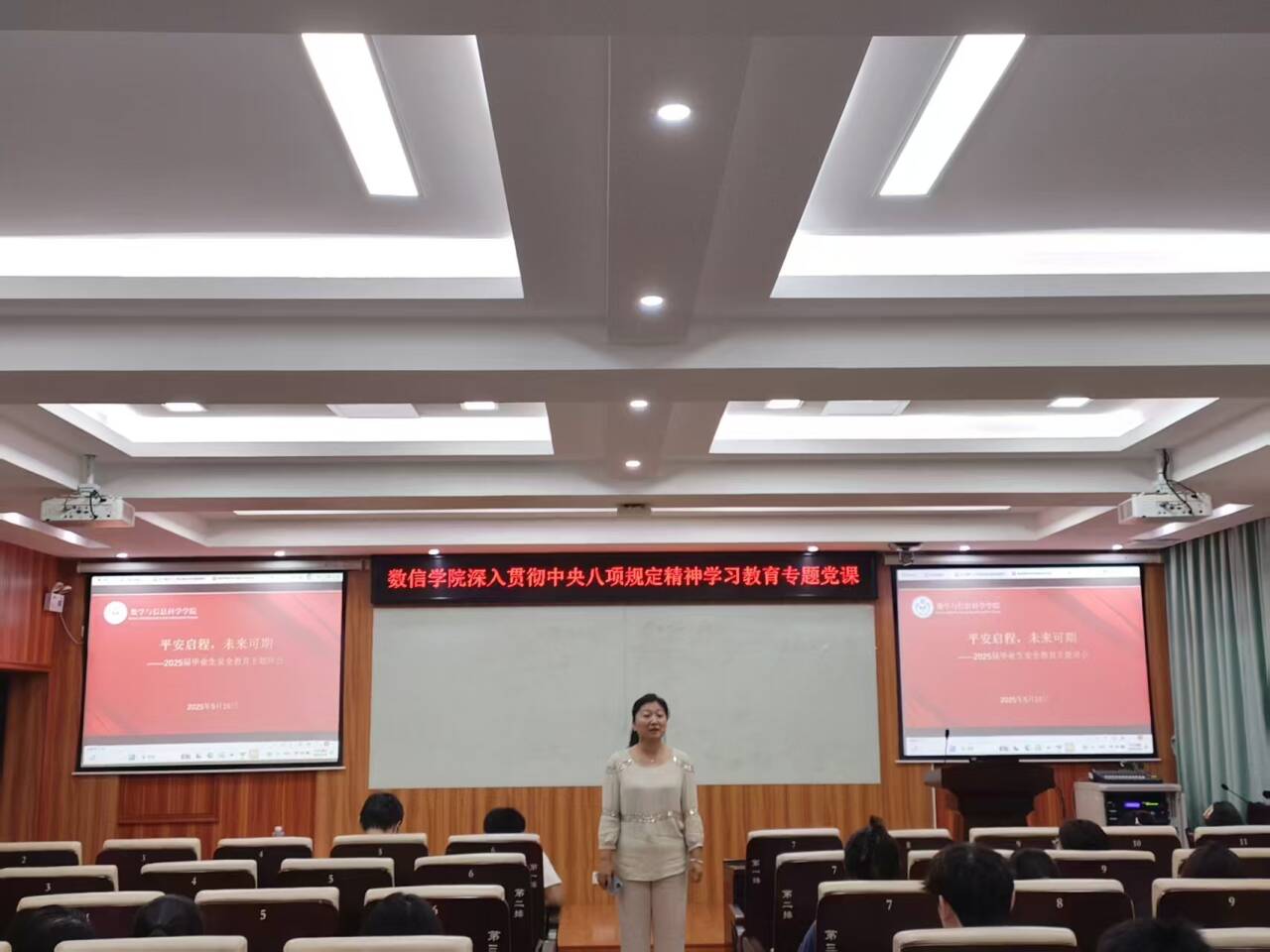 学院党委副书记、纪委书记唐旭彬为毕业生上“就业+廉洁”辅导课。她鼓励毕业生们抓住离校前的关键期,树立“先就业、再择业、敢创业”的积极心态,认清形势,主动出击,珍惜机遇,努力实现更充分、更高质量就业,她表示学院永远是毕业生们的坚强后盾,将持续提供就业服务和支持,助力每一位同学顺利启航。她结合社会现实和典型案例,深刻阐述了廉洁从业的重要性,强调要坚守职业道德底线,弘扬清风正气。她寄语毕业生在未来工作和生活中要常怀敬畏之心,清白做人、干净做事,系好职业生涯的“第一粒扣子”,永葆清廉本色,做新时代的有为青年。