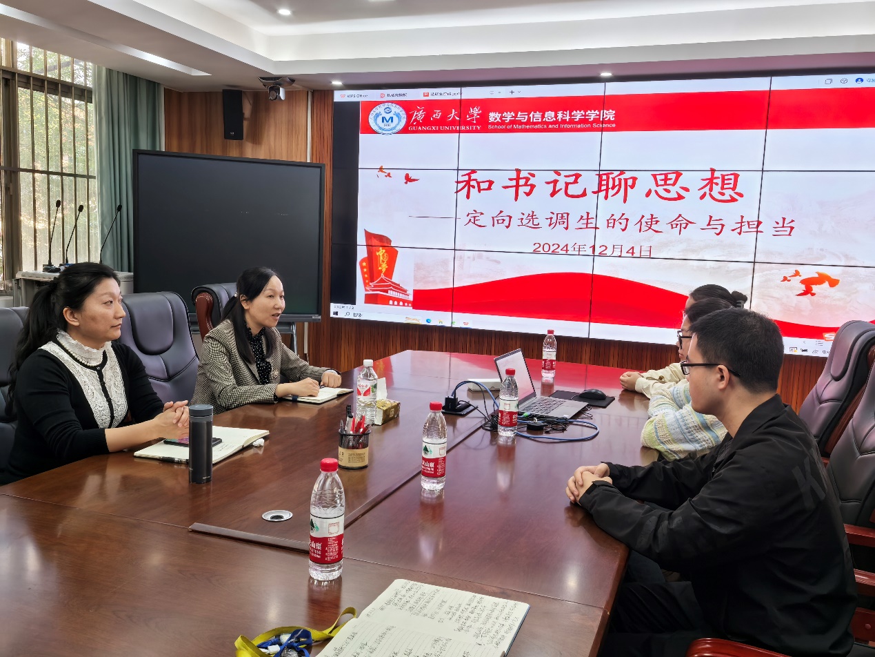 213会议室举行“和书记聊思想——定向选调生的使命与担当”交流会。学院党委书记吴华丽、副书记唐旭彬以及报考2025年定向广西大学选调生的全体同学参加了此次交流会。