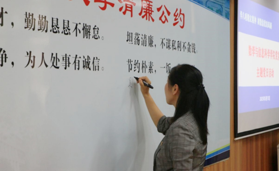 廉洁诚信,清廉公约签名倡议。学院纪委委员、教师党员代表韦琳娜和学生党员代表周培烽分别宣读了“学中央八项规定精神 树数信优良风尚”倡议书,倡议学院师生以实际行动践行中央八项规定精神,从自身做起、从现在做起,共同树立数信优良风尚。随后,参加活动的师生党员依次在广西大学清廉公约展板上签名承诺,践行清廉公约。