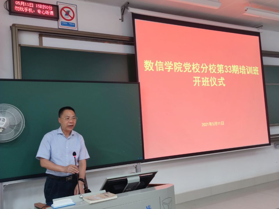 2021年5月11日下午,数信学院党校分校第33期培训班在六教301教室举行。院党委书记、分党校校长黄建荣出席开班仪式并致辞,仪式由院党委副书记、分党校副校长郭海燕主持。